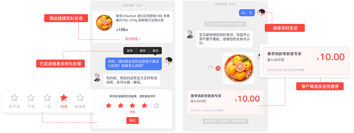 可支持文字、图片、语音、商品、订单、优惠券、二维码等对话方式,满足用户和客服之间多样化沟通需求。