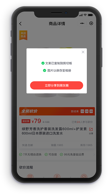 文案一键复制,图片一键保存,便于分销商用最简单便捷的方式轻松发圈,低成本高效率获取流量。