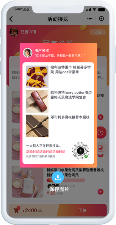 公众号、小程序接龙海报快速成生,实现微信群、朋友圈、线下扫码、 公众号多场景触达。